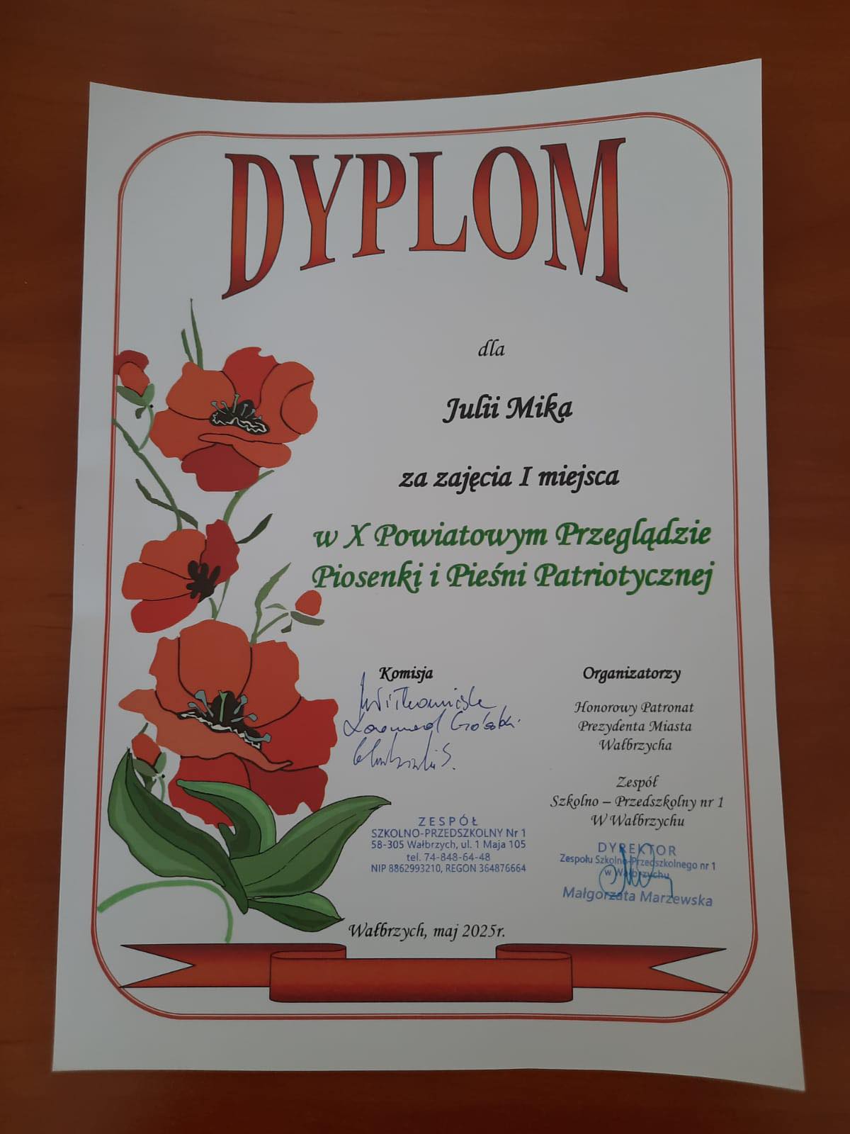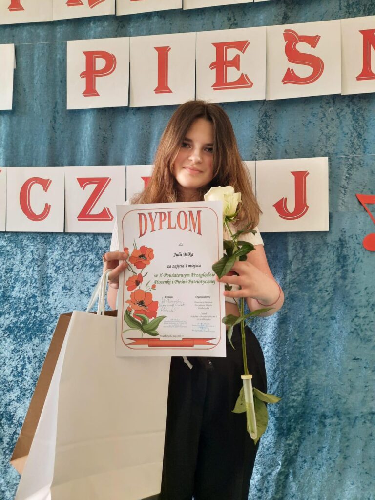 W dniu dzisiejszym w Zespole Szkolno-Przedszkolnym nr 1 w Wałbrzychu odbyła się X edycja Powiatowego Przeglądu Piosenki i Pieśni Patriotycznej. W przeglądzie naszą szkołę reprezentowała uczennica klasy VIII – Julia Mika, która przepięknie odśpiewała utwór pt. „Rozkwitały pąki białych róż ” i zajęła I miejsce.