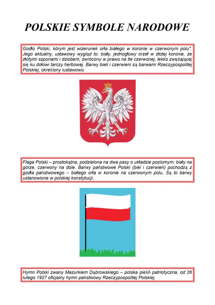 - Wykonanie pracy plastycznej, plakatu – symbole narodowe – technika dowolna.